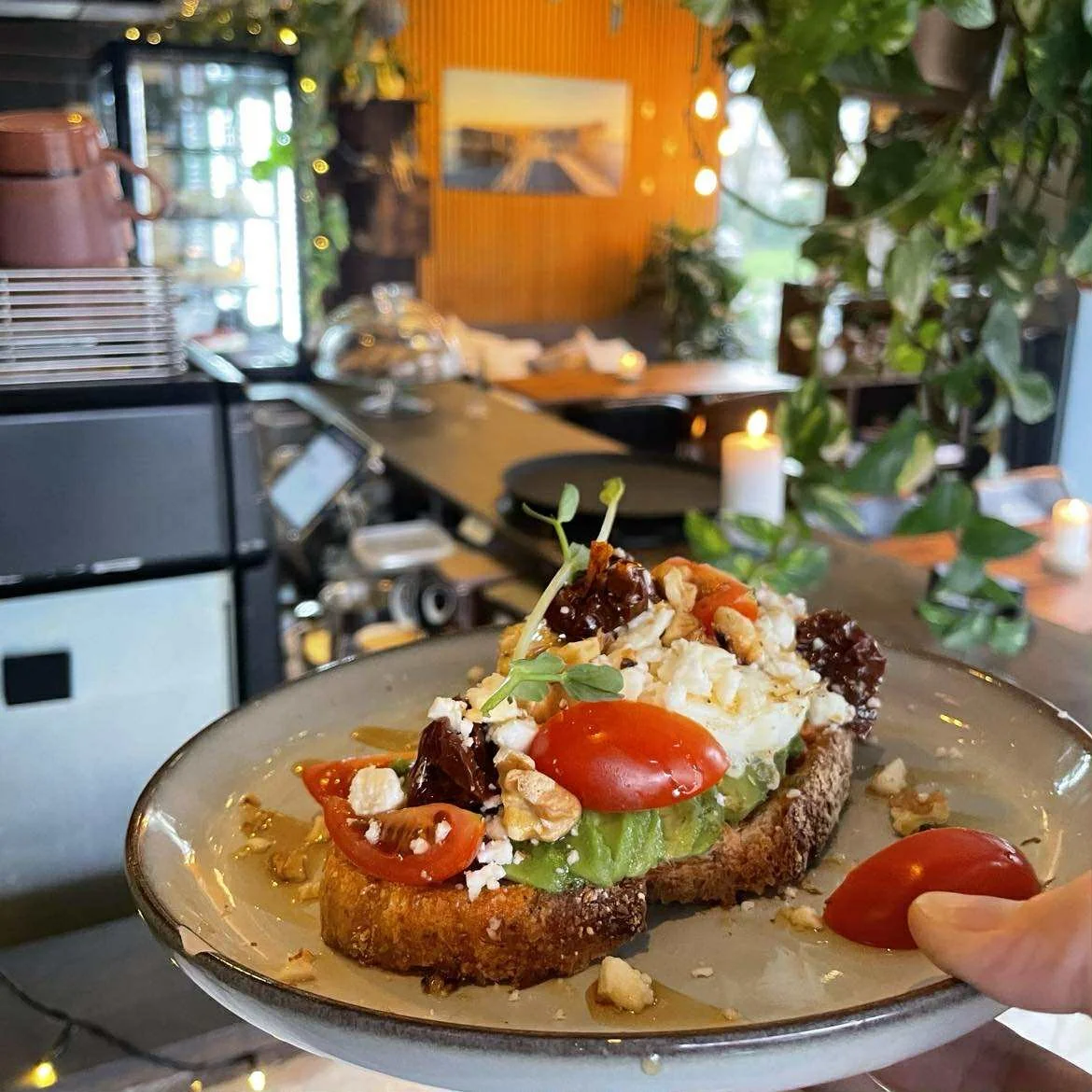 Idas avocado på surdejsbrød med smilende æg, feta, ristede valnødder , tomat og hot sirup 112,-